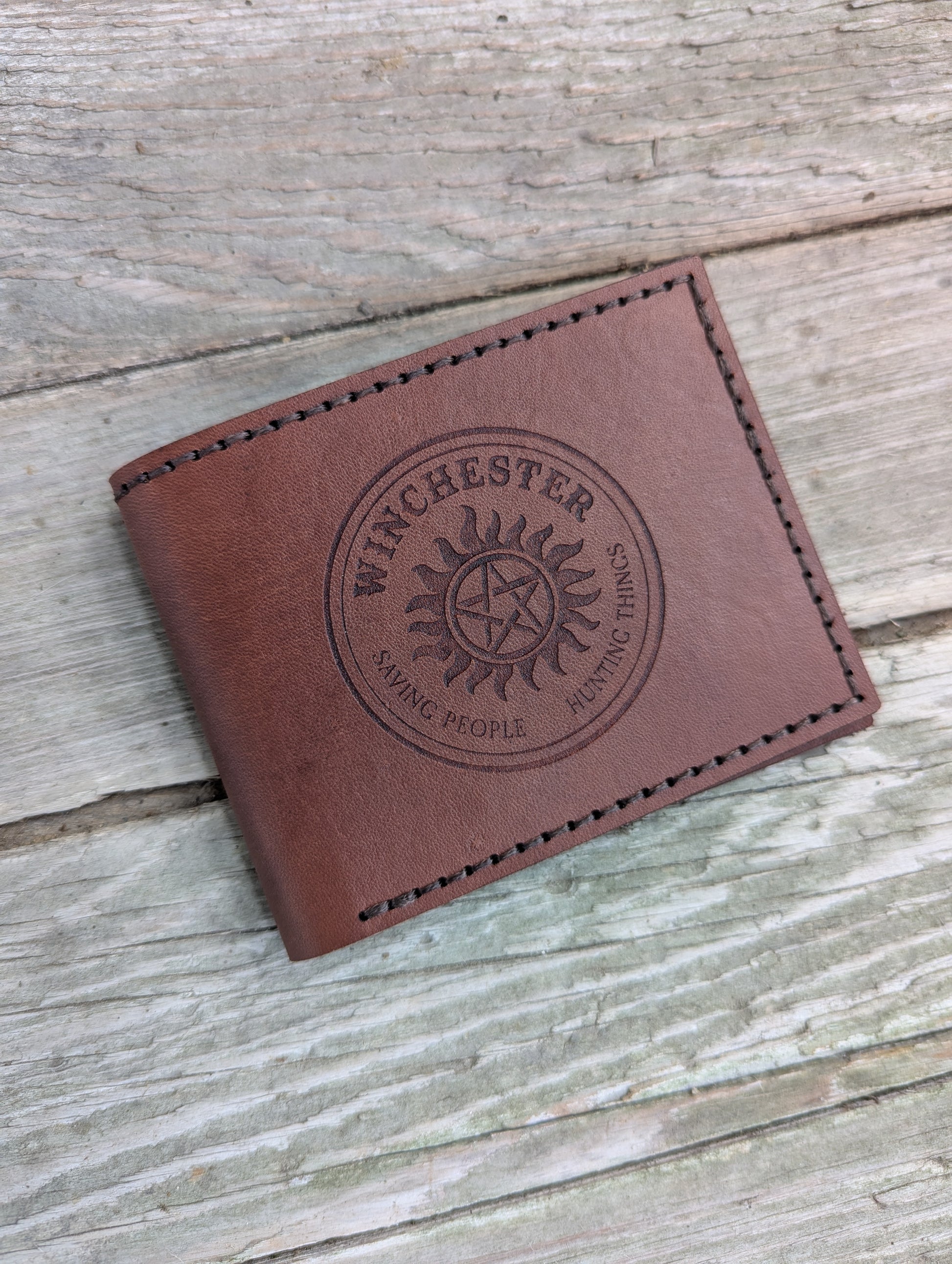 On the front, the iconic anti-possession symbol is deeply laser-engraved, ensuring your wallet is protected from any demonic forces—or at least, from looking generic. It's accompanied by the family name, "Winchester," and their famous motto: "Saving people, hunting things." The back is subtly personalized with the initials of the two legendary hunters, a quiet nod to their unbreakable bond.